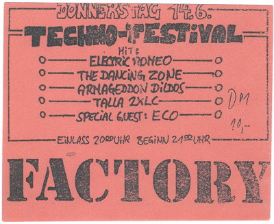 Radio Body Music : "Eines der traurigsten Momenten in meinem Leben war, als sich die Musik in der "Factory" schleichend veränderte. Das begann für mich aus der Sicht eines Besuchers damit, dass man am Freitag die Musik änderte uns als Erklärung verkündete : "Freitags lief es nicht!". Da ich aber jeden Freitag da war, kann ich es nicht im entfernetesten bestätigen dass es "nicht lief!". Dann kam das Techno-Übel! Am Anfang war es noch nicht klar wohin es lief, da wir noch aus der Prigogine Zeit durch den Aggrepo (der ja auch Frankfurt-Techno hieß) noch verwöhnt waren. Wie du vielleicht weisst, gab es eine hauseigene Zeitung des Technoclub/Dorian Gray aus Frankfurt namens Frontpage. Zu Beginnn war die Zeitung vollkommen auf EBM und New Beat eingeschossen und der Begriff "Techno" wurde für diese Musikrichtungen genutzt. Einer der Mitarbeiter des Frontpage (Jürgen Laarmann) entlehnte den Begriff Techno aber dann für die aufkommende House und Tekknoszene aus Berlin und er wurde dann für diese Art Musik weiterverwendet. Bedingt durch den "Electronic Body Music" Sampler von 1988 nuntzte mann dann erst diesen Begriff für das was bis dahin "Techno" war."