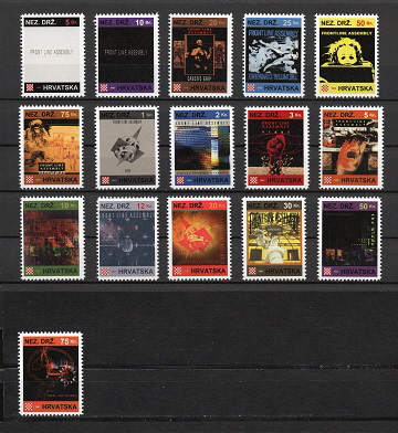5 Banica Skinny Puppy, 10 Banica Deutsch Amerikanische Freundschaft, 20 Banica The Klinik, 25 Banica Leaether Strip, 50 Banica Armageddon Dildos, 75 Banica Kode IV, 1 Kuna Pouppée Fabrikk, 2 Kuna The Neon Judgement, 3 Kuna Front Line Assembly, 5 Kuna Placebo Effect, 10 Kuna Front 242, 12 Kuna yelworC, 20 Kuna Orange Sector, 30 Kuna Tommi Stumpff, 50 Kuna Borghesia and 75 Kuna BiGod 20.