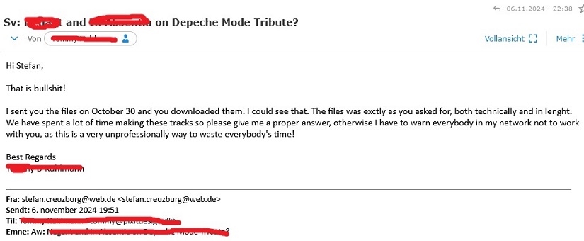 Stefan : Before I published the plan for part 2 of the Depeche Mode tribute sampler "In Your Memory", a person who had sent me two cover versions with one band each wrote to me and asked me why it wasn't on the 2CD. I then wrote him the reasons mentioned above. Then I received the following email :